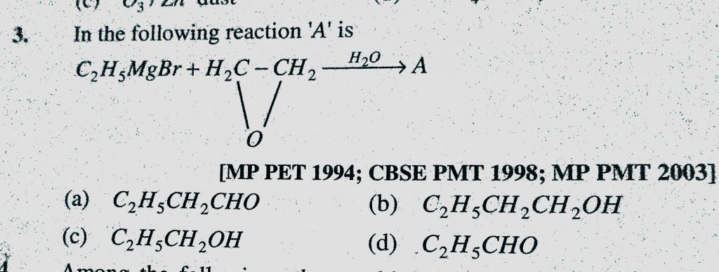 In the following reaction ‘A’ is (a) C2H5CH2CHO (b) C2H5CH2CH2OH (c) C2H5CH2OH (d) C2H5CHO In the following reaction 'A' is (a) C2H5CH2CHO (b) C2H5CH2CH2OH (c) C2H5CH2OH (d) C2H5CHO February 10, 2021 Category: Uncategorised (JEE Advanced Physics by BM Sharma + GMP Solutions) , Facebook Messenger WhatsApp Share this:TwitterFacebook Related
