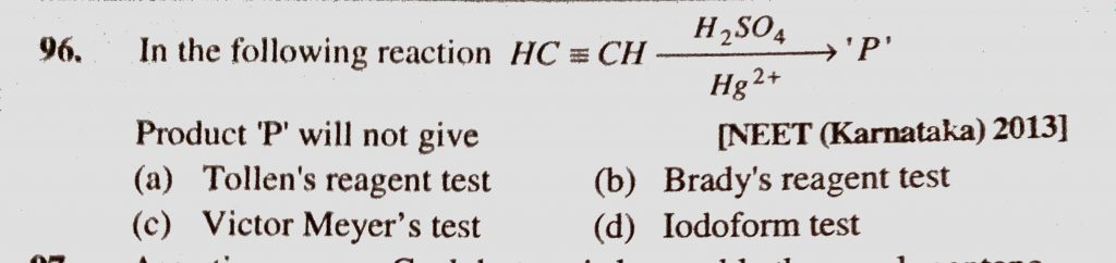 In the following reaction HC =_ CH H2SO4 Hg 2+ ‘P’ Product ‘P’ will not give (a) Tollen’s reagent test (b) Brady’s reagent test (c) Victor Meyer’s test (d) Iodoform test In the following reaction HC =_ CH H2SO4 Hg 2+ 'P' Product 'P' will not give (a) Tollen's reagent test (b) Brady's reagent test (c) Victor Meyer's test (d) Iodoform test December 14, 2020 Category: Uncategorised (JEE Advanced Physics by BM Sharma + GMP Solutions) , Facebook Messenger WhatsApp Share this:TwitterFacebook Related