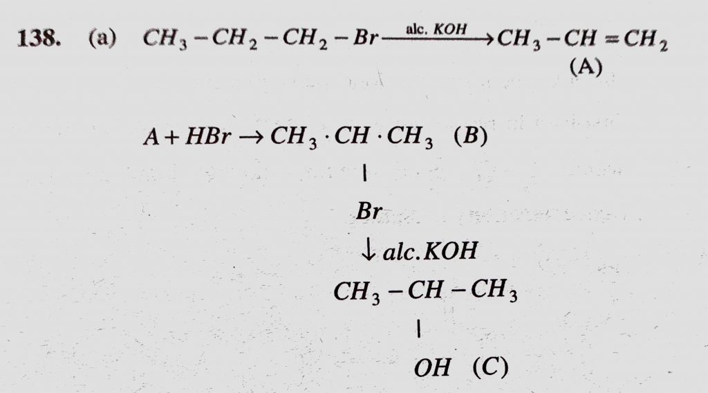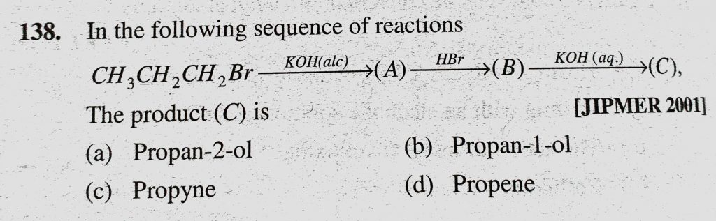 In the following sequence of reactions CH3CH2CH2Br KOH (a/c) (A) HBr (B) KOH(aq.) (C), The product (C) is (a) Propan -2-ol (b) Propan-1-ol (c) Propyne (d) Propene In the following sequence of reactions CH3CH2CH2Br KOH (a/c) (A) HBr (B) KOH(aq.) (C) The product (C) is (a) Propan -2-ol (b) Propan-1-ol (c) Propyne (d) Propene February 8, 2021 Category: Uncategorised (JEE Advanced Physics by BM Sharma + GMP Solutions) , Facebook Messenger WhatsApp Share this:TwitterFacebook Related