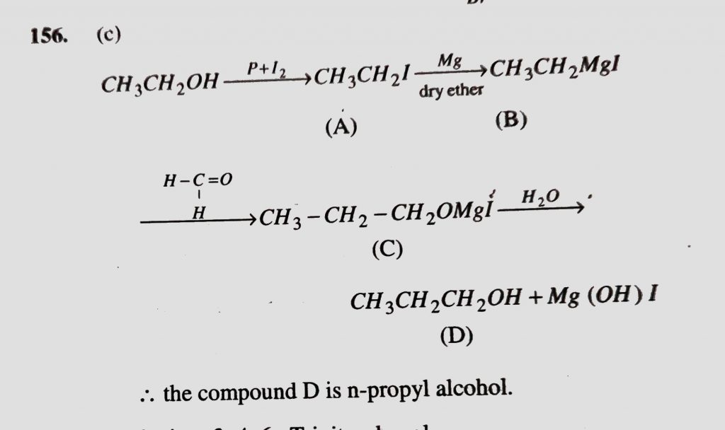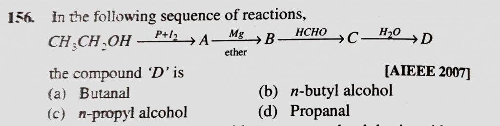 In the following sequence of reactions, the compound ‘D’ is (a) Butanal (b) n-butyl alcohol (c) n-propyl alcohol (d) Propanal In the following sequence of reactions the compound 'D' is (a) Butanal (b) n-butyl alcohol (c) n-propyl alcohol (d) Propanal February 14, 2021 Category: Uncategorised (JEE Advanced Physics by BM Sharma + GMP Solutions) , Facebook Messenger WhatsApp Share this:TwitterFacebook Related