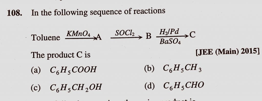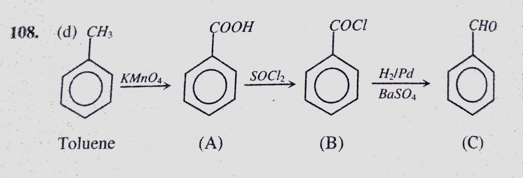 In the following sequence of reactions Toluene KMnO4 A SOCl2 B H2/Pd BaSO4 C The product C is (a) C6H5COOH (b) C6H5CH3 (c) C6H5CH2OH In the following sequence of reactions Toluene KMnO4 A SOCl2 B H2/Pd BaSO4 C The product C is (a) C6H5COOH (b) C6H5CH3 (c) C6H5CH2OH December 16, 2020 Category: Uncategorised (JEE Advanced Physics by BM Sharma + GMP Solutions) , Facebook Messenger WhatsApp Share this:TwitterFacebook Related