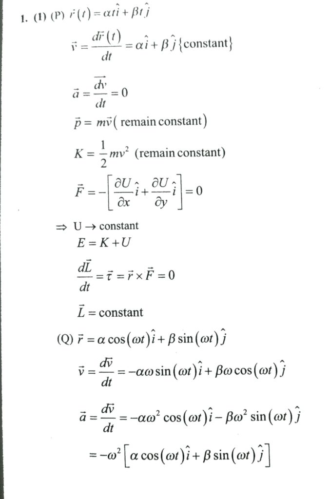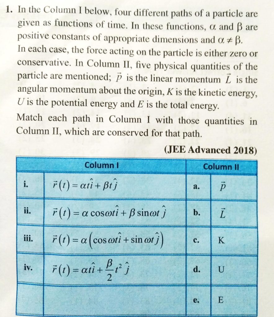 In the List-I below, four different paths of a particle are given as functions of time. In these functions, and are positive constants of appropriate dimensions and . In each case, the force acting on the particle is either zero or conservative. In List-II, five physical quantities of the particle are mentioned: is the linear momentum, is the angular momentum about the origin, is the kinetic energy, is the potential energy and is the total energy. Match each path in List-I with those quantities in List-II, which are conserved for that path.