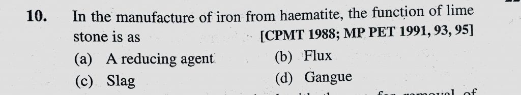 In the manufacture of iron from haematite, the function of lime stone is as (a) A reducing agent (b) Flux (c) Slag (d) Gangue In the manufacture of iron from haematite the function of lime stone is as (a) A reducing agent (b) Flux (c) Slag (d) Gangue November 11, 2020 Category: Uncategorised (JEE Advanced Physics by BM Sharma + GMP Solutions) , Facebook Messenger WhatsApp Share this:TwitterFacebook Related