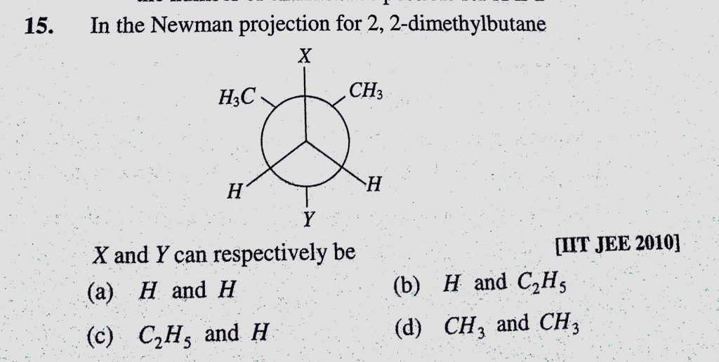 In the Newman projection for 2,2-dimethylbutane X and Y can respectively be (a) H and H (b) H and C2H5 (c) C2H5 and H 2-dimethylbutane X and Y can respectively be (a) H and H (b) H and C2H5 (c) C2H5 and H In the Newman projection for 2 December 12, 2020 Category: Uncategorised (JEE Advanced Physics by BM Sharma + GMP Solutions) , Facebook Messenger WhatsApp Share this:TwitterFacebook Related