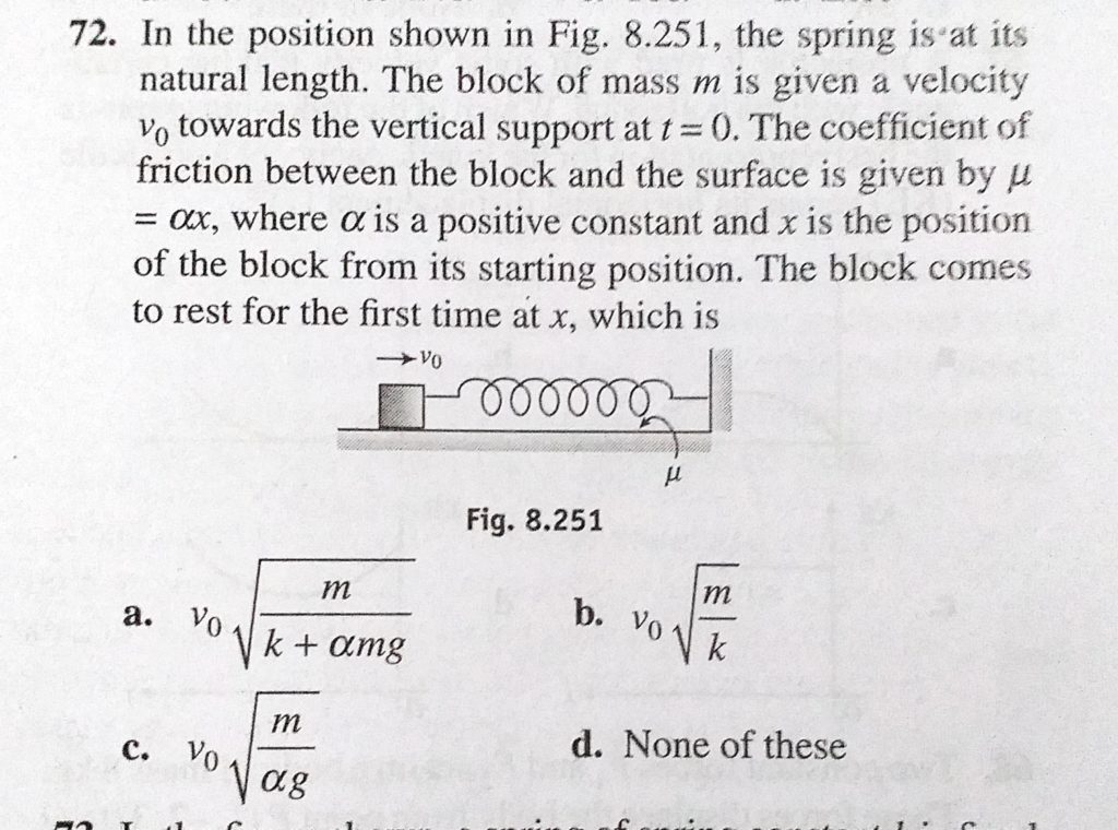 In the position shown in Fig. 8.251, the spring is at its natural length. The block of mass m is given a velocity v0 towards the vertical support at t = 0. The coefficient of friction between the block In the position shown in Fig. 8.251 the spring is at its natural length. The block of mass m is given a velocity v0 towards the vertical support at t = 0. The coefficient of friction between the block October 4, 2020 Category: Uncategorised (JEE Advanced Physics by BM Sharma + GMP Solutions) , Facebook Messenger WhatsApp Share this:TwitterFacebook Related