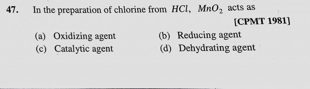 In the preparation of chlorine from HCl, MnO2 acts as (a) Oxidizing agent (b) Reducing agent (c) Catalytic agent (d) Dehydrating agent In the preparation of chlorine from HCl MnO2 acts as (a) Oxidizing agent (b) Reducing agent (c) Catalytic agent (d) Dehydrating agent November 24, 2020 Category: Uncategorised (JEE Advanced Physics by BM Sharma + GMP Solutions) , Facebook Messenger WhatsApp Share this:TwitterFacebook Related