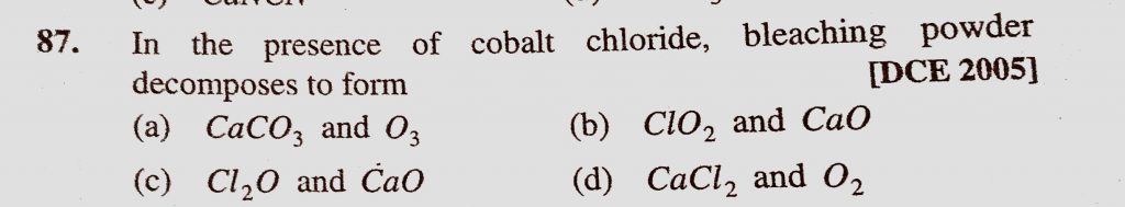 In the presence of cobalt chloride, bleaching powder decomposes to form (a) CaCO3 and O3 (b) ClO2 and CaO (c) Cl2O and CaO bleaching powder decomposes to form (a) CaCO3 and O3 (b) ClO2 and CaO (c) Cl2O and CaO In the presence of cobalt chloride November 17, 2020 Category: Uncategorised (JEE Advanced Physics by BM Sharma + GMP Solutions) , Facebook Messenger WhatsApp Share this:TwitterFacebook Related