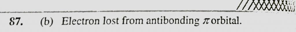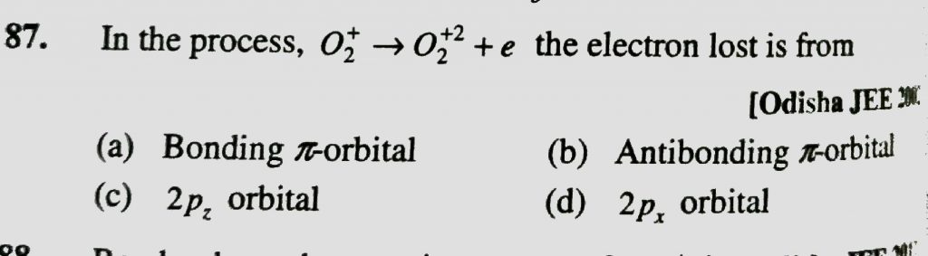 In the process , O2 ^+ gives O2^+2 + e the electron lost is from (a0 Bonding pie orbital (b) antibonding pie orbital (c) 2pz orbital (d) 2px orbital In the process O2 ^+ gives O2^+2 + e the electron lost is from (a0 Bonding pie orbital (b) antibonding pie orbital (c) 2pz orbital (d) 2px orbital December 8, 2020 Category: Uncategorised (JEE Advanced Physics by BM Sharma + GMP Solutions) , Facebook Messenger WhatsApp Share this:TwitterFacebook Related