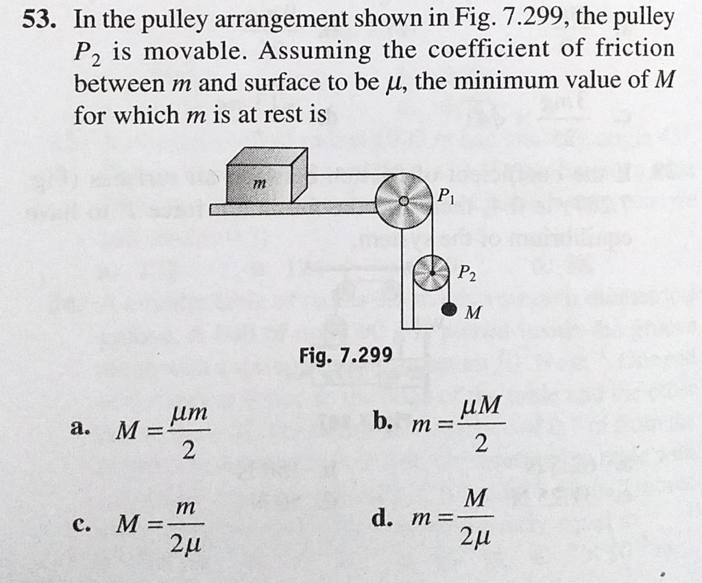 In the pulley arrangement shown in Fig. 7.299, the pulley P2 is movable. Assuming the coefficient of friction between m and surface to be mu, the minimum value of M for which m is at rest is In the pulley arrangement shown in Fig. 7.299 the minimum value of M for which m is at rest is the pulley P2 is movable. Assuming the coefficient of friction between m and surface to be mu October 1, 2020 Category: Uncategorised (JEE Advanced Physics by BM Sharma + GMP Solutions) , Facebook Messenger WhatsApp Share this:TwitterFacebook Related