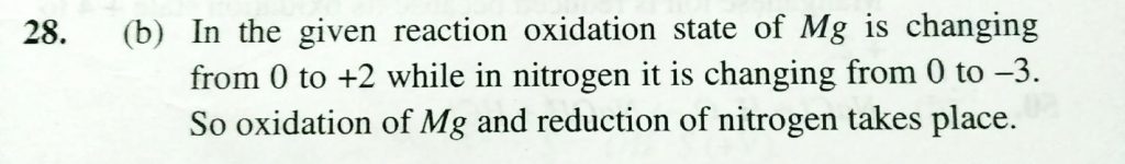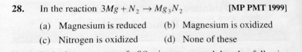 In the reaction 3Mg +N2 gives Mg3N2 (a) Magnesium is reduced (b) magnesium is oxidized (c) nitrogen is oxidized (d) none of these In the reaction 3Mg +N2 gives Mg3N2 (a) Magnesium is reduced (b) magnesium is oxidized (c) nitrogen is oxidized (d) none of these November 23, 2020 Category: Uncategorised (JEE Advanced Physics by BM Sharma + GMP Solutions) , Facebook Messenger WhatsApp Share this:TwitterFacebook Related