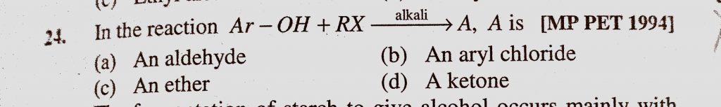 In the reaction Ar-OH + RX gives A, A is (a) An aldehyde (b) An aryl chloride (c) An ether (d) A ketone A is (a) An aldehyde (b) An aryl chloride (c) An ether (d) A ketone In the reaction Ar-OH + RX gives A February 10, 2021 Category: Uncategorised (JEE Advanced Physics by BM Sharma + GMP Solutions) , Facebook Messenger WhatsApp Share this:TwitterFacebook Related