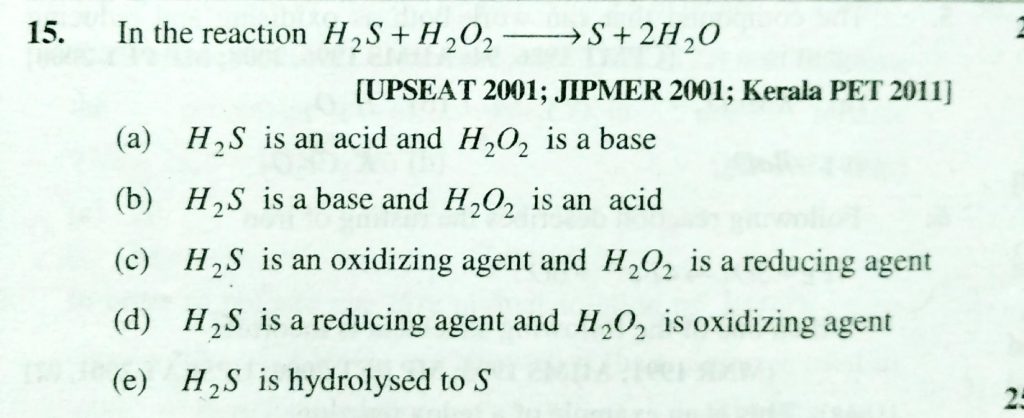 In the reaction H2 S +H2O2 gives S + 2H2O (a) H2S is an acid and H2O2 is a base (b) H2S is a base and H2O2 is an caid (c) H2S is an oxidizing agent and H2O2 is a reducing agent (d) H2S is a reducing agent and H2O2 Is a oxidizing agent H2O acts as (a) Oxidising agent (b) Reducing agent (c) a and b both (d) none of these In C+H2O gives H2 November 23, 2020 Category: Uncategorised (JEE Advanced Physics by BM Sharma + GMP Solutions) , Facebook Messenger WhatsApp Share this:TwitterFacebook Related