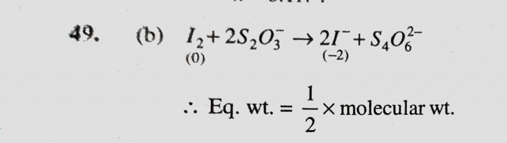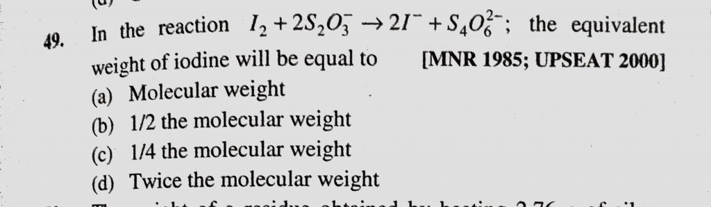 In the reaction I2 + 2S2O3 to 2I- + S4O6 2-; the equivalent weight of iodine will be equal to In the reaction I2 + 2S2O3 to 2I- + S4O6 2-; the equivalent weight of iodine will be equal to December 7, 2020 Category: Uncategorised (JEE Advanced Physics by BM Sharma + GMP Solutions) , Facebook Messenger WhatsApp Share this:TwitterFacebook Related