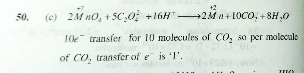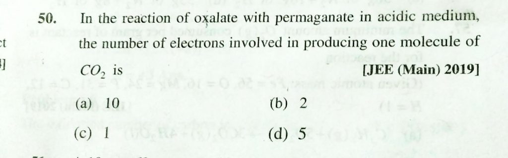 In the reaction of oxalate with permaganate in acidic medium , the number of electrons involved in producing one molecule of CO2 is In the reaction of oxalate with permaganate in acidic medium the number of electrons involved in producing one molecule of CO2 is November 25, 2020 Category: Uncategorised (JEE Advanced Physics by BM Sharma + GMP Solutions) , Facebook Messenger WhatsApp Share this:TwitterFacebook Related