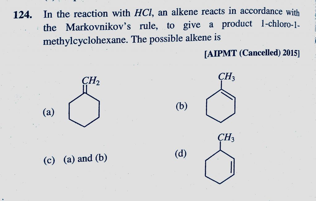 In the reaction with HCl, an alkene reacts in accordance with the Markovnikov’s rule, to give a product 1-chloro-1-methylcyclohexane. The possible alkene is an alkene reacts in accordance with the Markovnikov's rule In the reaction with HCl to give a product 1-chloro-1-methylcyclohexane. The possible alkene is December 14, 2020 Category: Uncategorised (JEE Advanced Physics by BM Sharma + GMP Solutions) , Facebook Messenger WhatsApp Share this:TwitterFacebook Related