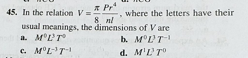 In the relation V = pie Pr^4 / 8 nl, where the letters have their usual meanings, the dimensions of V are In the relation V = pie Pr^4 / 8 nl the dimensions of V are where the letters have their usual meanings September 15, 2020 Category: Uncategorised (JEE Advanced Physics by BM Sharma + GMP Solutions) , Facebook Messenger WhatsApp Share this:TwitterFacebook Related