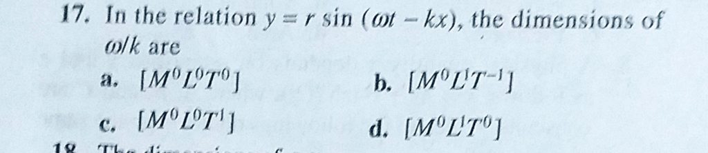 In the relation y = r sin (omega t – kx), the dimensions of omega/k are In the relation y = r sin (omega t - kx) the dimensions of omega/k are September 15, 2020 Category: Uncategorised (JEE Advanced Physics by BM Sharma + GMP Solutions) , Facebook Messenger WhatsApp Share this:TwitterFacebook Related