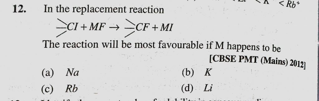In the replacement reaction The reaction will be most favorable if M happens to be (a) Na (b) K (c) Rb (D) Li In the replacement reaction The reaction will be most favorable if M happens to be (a) Na (b) K (c) Rb (D) Li November 13, 2020 Category: Uncategorised (JEE Advanced Physics by BM Sharma + GMP Solutions) , Facebook Messenger WhatsApp Share this:TwitterFacebook Related