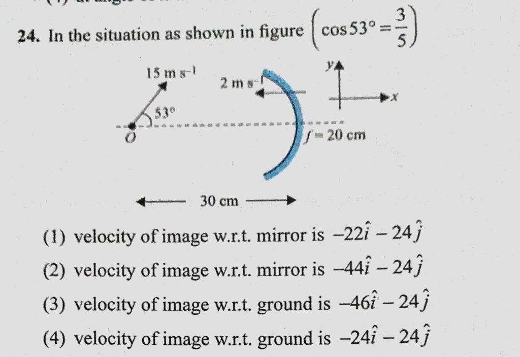 In the situation in figure ( cos 53 = 3/5) (1) velocity of image w.r.t. mirror is -22i -24 j (2) velocity of image w.r.t. mirror is -44i -24j In the situation in figure ( cos 53 = 3/5) (1) velocity of image w.r.t. mirror is -22i -24 j (2) velocity of image w.r.t. mirror is -44i -24j October 7, 2020 Category: Uncategorised (JEE Advanced Physics by BM Sharma + GMP Solutions) , Facebook Messenger WhatsApp Share this:TwitterFacebook Related