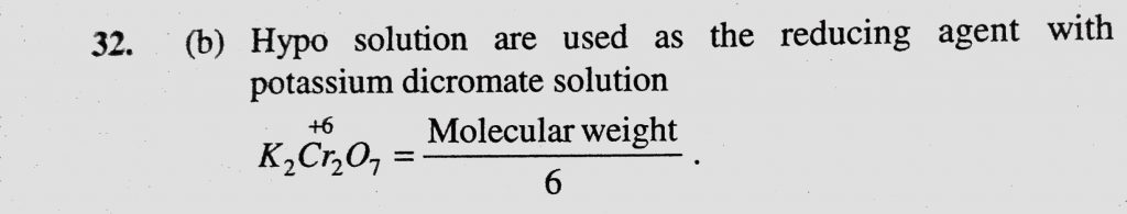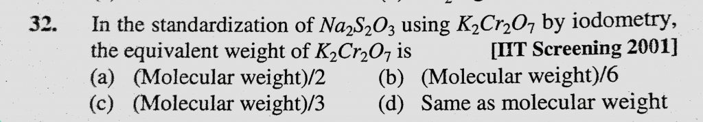 In the standardization of Na2S2O3 using K2Cr2O7 by iodometry, the equivalent weight of K2Cr2O7 is In the standardization of Na2S2O3 using K2Cr2O7 by iodometry the equivalent weight of K2Cr2O7 is December 8, 2020 Category: Uncategorised (JEE Advanced Physics by BM Sharma + GMP Solutions) , Facebook Messenger WhatsApp Share this:TwitterFacebook Related