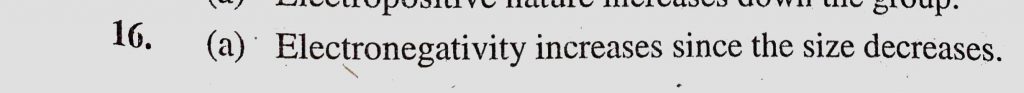 In third row of periodic table from Na to Cl (a) Electronegativity increases (b) Electronegativity decreases (c) Ionisation energy decreases In third row of periodic table from Na to Cl (a) Electronegativity increases (b) Electronegativity decreases (c) Ionisation energy decreases November 10, 2020 Category: Uncategorised (JEE Advanced Physics by BM Sharma + GMP Solutions) , Facebook Messenger WhatsApp Share this:TwitterFacebook Related