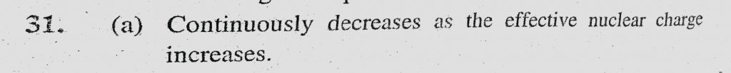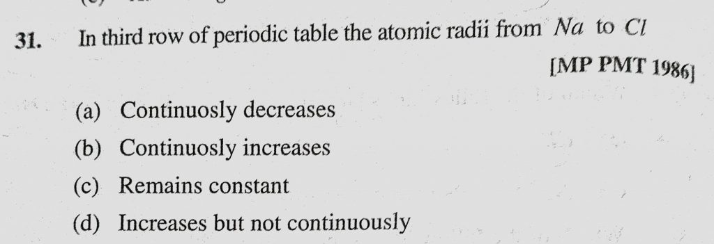 In third row of periodic table the atomic radii from Na to Cl (a) Continuosly decreases (b) Continuosly increases (c) Remains constant In third row of periodic table the atomic radii from Na to Cl (a) Continuosly decreases (b) Continuosly increases (c) Remains constant November 9, 2020 Category: Uncategorised (JEE Advanced Physics by BM Sharma + GMP Solutions) , Facebook Messenger WhatsApp Share this:TwitterFacebook Related