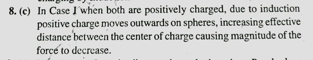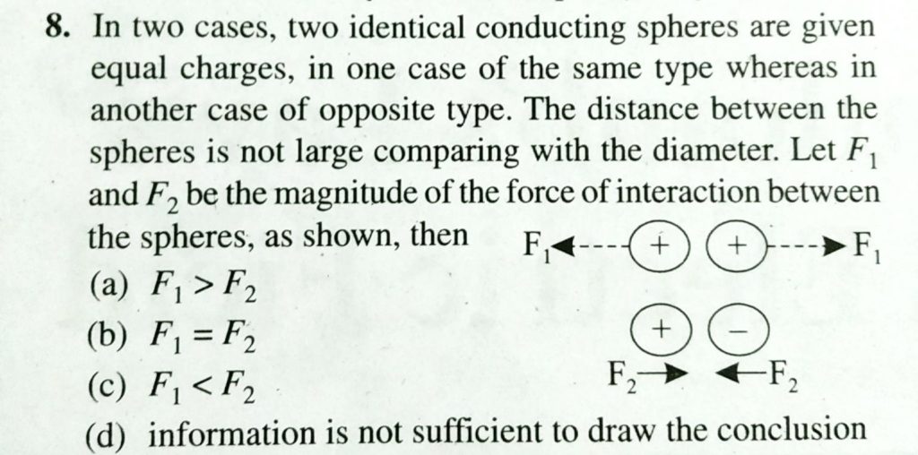 In two cases, two identical conducting sphere are given equal charges, in one case of the same type whereas in another case of opposite type. The distance between the spheres is not large comparing with the diameter. Let F1 and F2 be the magnitudes of the force of interaction between the spheres, as shown, then