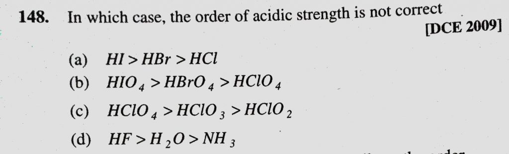 In which case, the order of acidic strength is not correct (a) HI > HBr > HCl (b) HIO4 > HBrO4 > HClO4 In which case the order of acidic strength is not correct (a) HI > HBr > HCl (b) HIO4 > HBrO4 > HClO4 November 25, 2020 Category: Uncategorised (JEE Advanced Physics by BM Sharma + GMP Solutions) , Facebook Messenger WhatsApp Share this:TwitterFacebook Related