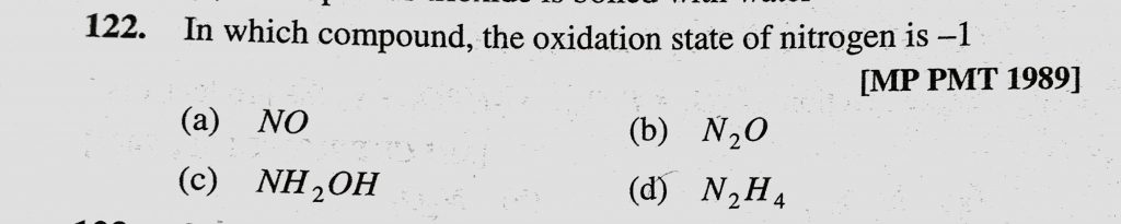 In which compound, the oxidation state of nitrogen is (a)NO (b) N2O (c) NH2OH (d) N2H4 In which compound the oxidation state of nitrogen is (a)NO (b) N2O (c) NH2OH (d) N2H4 November 22, 2020 Category: Uncategorised (JEE Advanced Physics by BM Sharma + GMP Solutions) , Facebook Messenger WhatsApp Share this:TwitterFacebook Related