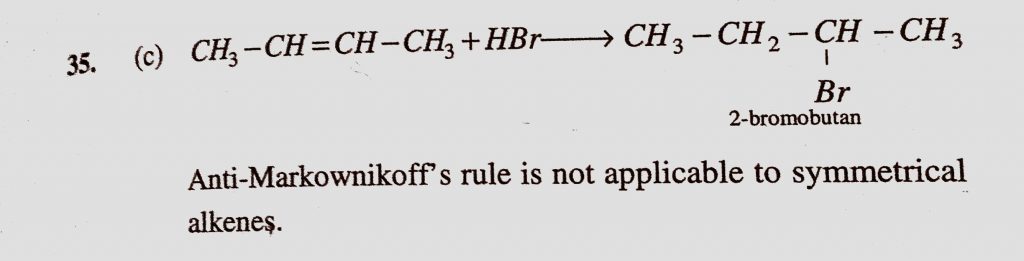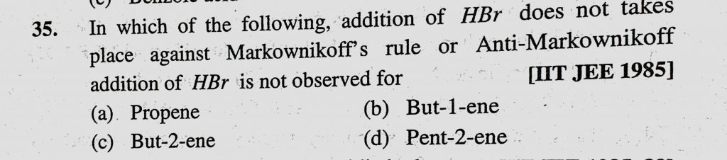 In which of the following addition of HBr does not takes place against Markownikoff’s rule or Anti-Markownikoff addition of HBr is not observed for (a) Propene (b) But-1-ene (c) But-2-ene In which of the following addition of HBr does not takes place against Markownikoff's rule or Anti-Markownikoff addition of HBr is not observed for (a) Propene (b) But-1-ene (c) But-2-ene December 16, 2020 Category: Uncategorised (JEE Advanced Physics by BM Sharma + GMP Solutions) , Facebook Messenger WhatsApp Share this:TwitterFacebook Related