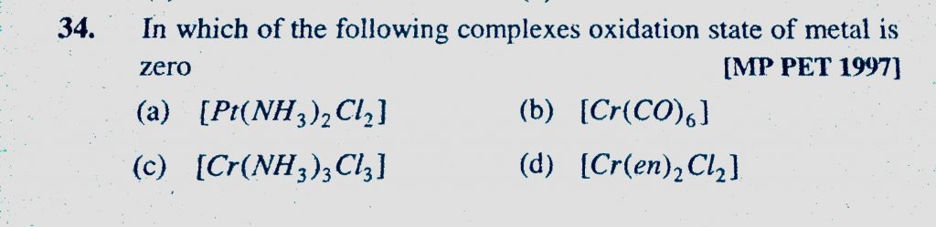 In which of the following complexes oxidation state of metal is zero (a) (Pt(NH3)2Cl2) (b) (Cr(CO)6) In which of the following complexes oxidation state of metal is zero (a) (Pt(NH3)2Cl2) (b) (Cr(CO)6) December 4, 2020 Category: Uncategorised (JEE Advanced Physics by BM Sharma + GMP Solutions) , Facebook Messenger WhatsApp Share this:TwitterFacebook Related