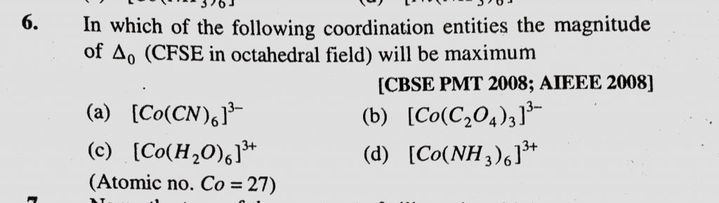 In which of the following coordination entities the magnitude of delta 0 (CFSE in octahedral field) will be maximum In which of the following coordination entities the magnitude of delta 0 (CFSE in octahedral field) will be maximum December 4, 2020 Category: Uncategorised (JEE Advanced Physics by BM Sharma + GMP Solutions) , Facebook Messenger WhatsApp Share this:TwitterFacebook Related