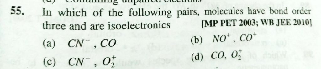 In which of the following pairs , molecules have bond order three and are isoelectronics In which of the following pairs molecules have bond order three and are isoelectronics December 8, 2020 Category: Uncategorised (JEE Advanced Physics by BM Sharma + GMP Solutions) , Facebook Messenger WhatsApp Share this:TwitterFacebook Related