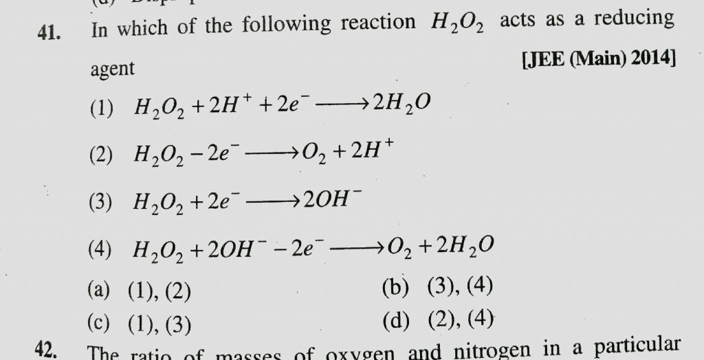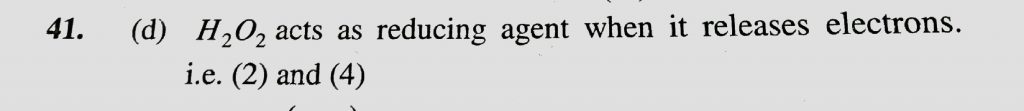 In which of the following reaction H2O2 acts as a reducing agent (1) H2O2 +2H^+ +2e^- gives 2H2O (2) H2O2 – 2e gives O2 +2H^+ (3) H2O2 +2OH^- -2e^- gives O2 +2H2O In which of the following reaction H2O2 acts as a reducing agent (1) H2O2 +2H^+ +2e^- gives 2H2O (2) H2O2 - 2e gives O2 +2H^+ (3) H2O2 +2OH^- -2e^- gives O2 +2H2O November 25, 2020 Category: Uncategorised (JEE Advanced Physics by BM Sharma + GMP Solutions) , Facebook Messenger WhatsApp Share this:TwitterFacebook Related
