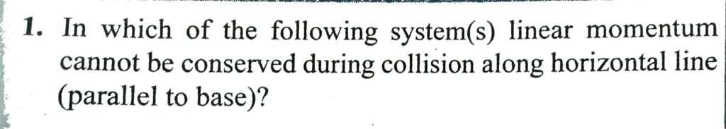 In which of the following systems linear momentum cannot be conserved during collision along horizontal line ( parallel to base ) ? In which of the following systems linear momentum cannot be conserved during collision along horizontal line ( parallel to base ) ? September 22, 2020 Category: Uncategorised (JEE Advanced Physics by BM Sharma + GMP Solutions) , Facebook Messenger WhatsApp Share this:TwitterFacebook Related