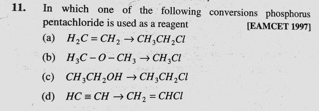 In which one of the following conversions phosphorus pentachloride is used as a reagent (a) H2C = CH2 to CH3CH2Cl (b) H3C-O-CH3 to CH3Cl In which one of the following conversions phosphorus pentachloride is used as a reagent (a) H2C = CH2 to CH3CH2Cl (b) H3C-O-CH3 to CH3Cl February 9, 2021 Category: Uncategorised (JEE Advanced Physics by BM Sharma + GMP Solutions) , Facebook Messenger WhatsApp Share this:TwitterFacebook Related