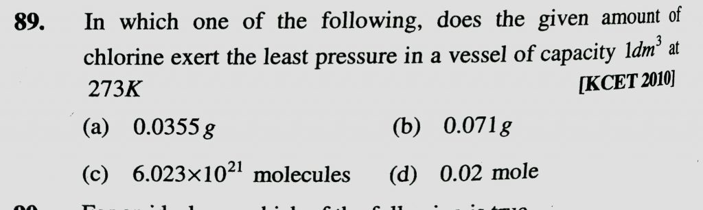 In which one of the following , does the given amount of chlorine exert the least pressure in a vessel of capacity 1 dm^3 at 273 K does the given amount of chlorine exert the least pressure in a vessel of capacity 1 dm^3 at 273 K In which one of the following February 11, 2021 Category: Uncategorised (JEE Advanced Physics by BM Sharma + GMP Solutions) , Facebook Messenger WhatsApp Share this:TwitterFacebook Related