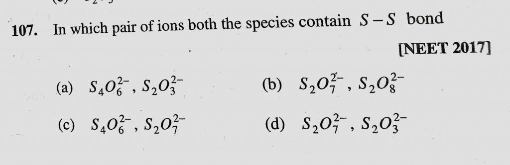 In which pair of ions both the species contain S – S bond (a) S4O6 2- , S2O3 2- In which pair of ions both the species contain S - S bond (a) S4O6 2- S2O3 2- November 24, 2020 Category: Uncategorised (JEE Advanced Physics by BM Sharma + GMP Solutions) , Facebook Messenger WhatsApp Share this:TwitterFacebook Related
