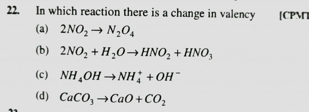 In which reaction there is a change in valency (a) 2NO2 gives N2O4 (b) 2NO2 +H2O gives HNO2 +HNO3 (c) NH4OH gives NH4^+ + OH^- In which reaction there is a change in valency (a) 2NO2 gives N2O4 (b) 2NO2 +H2O gives HNO2 +HNO3 (c) NH4OH gives NH4^+ + OH^- November 23, 2020 Category: Uncategorised (JEE Advanced Physics by BM Sharma + GMP Solutions) , Facebook Messenger WhatsApp Share this:TwitterFacebook Related