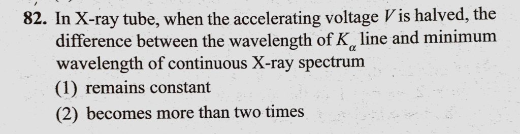 In X-ray tube, when the accelerating voltage V is halved, the difference between the wavelength of K alpha line and minimum wavelength of continuous X-ray spectrum In X-ray tube the difference between the wavelength of K alpha line and minimum wavelength of continuous X -ray spectrum when the accelerating voltage V is halved October 16, 2020 Category: Uncategorised (JEE Advanced Physics by BM Sharma + GMP Solutions) , Facebook Messenger WhatsApp Share this:TwitterFacebook Related