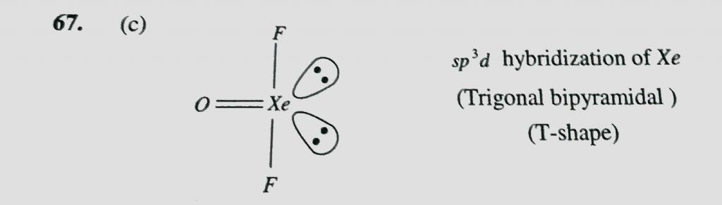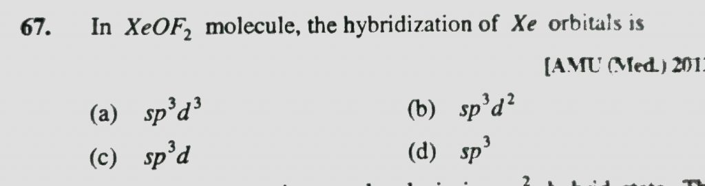 In XeOF2 molecule , the hybridization of Xe orbitals is (a) sp^3d^3 (b) sp^3d^2 (c) sp^3d (d) sp^3 In XeOF2 molecule the hybridization of Xe orbitals is (a) sp^3d^3 (b) sp^3d^2 (c) sp^3d (d) sp^3 December 6, 2020 Category: Uncategorised (JEE Advanced Physics by BM Sharma + GMP Solutions) , Facebook Messenger WhatsApp Share this:TwitterFacebook Related