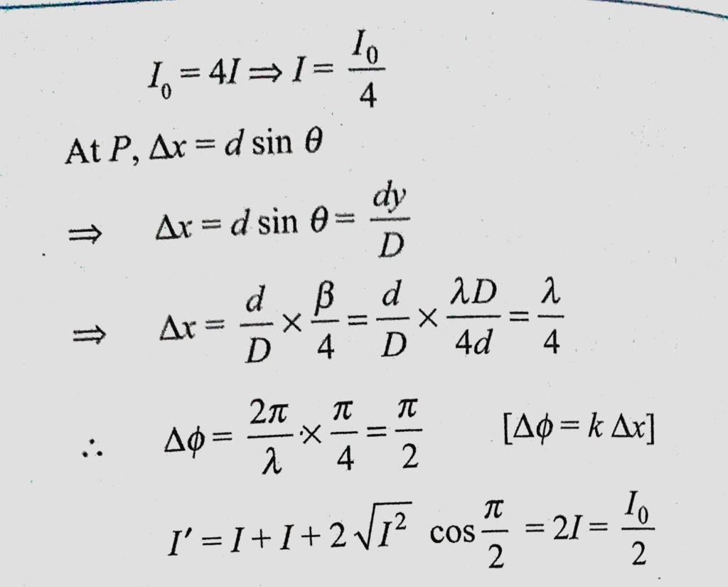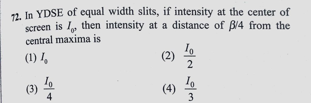 In YDSE of equal width slits, if intensity at the center of screen is I0, then intensity at a distance of beta/4 from the central maxima is if intensity at the center of screen is I0 In YDSE of equal width slits then intensity at a distance of beta/4 from the central maxima is October 10, 2020 Category: Uncategorised (JEE Advanced Physics by BM Sharma + GMP Solutions) , Facebook Messenger WhatsApp Share this:TwitterFacebook Related