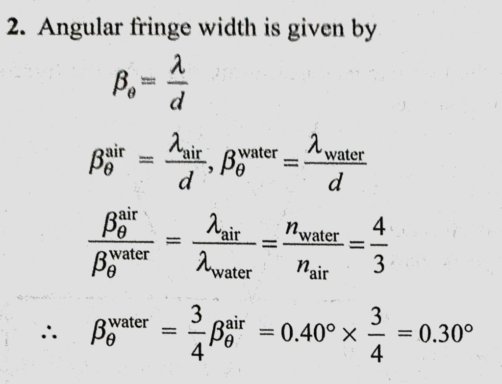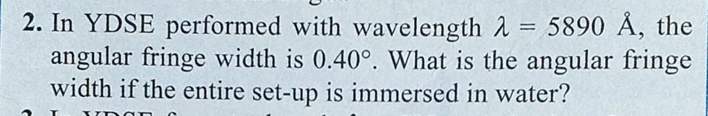 In YDSE performed with wavelength lemda = 5890 A, the angular fringe width is 0.40. What is the angular fringe width if the entire set-up is immersed in water? In YDSE performed with wavelength lemda = 5890 A the angular fringe width is 0.40. What is the angular fringe width if the entire set-up is immersed in water? October 9, 2020 Category: Uncategorised (JEE Advanced Physics by BM Sharma + GMP Solutions) , Facebook Messenger WhatsApp Share this:TwitterFacebook Related