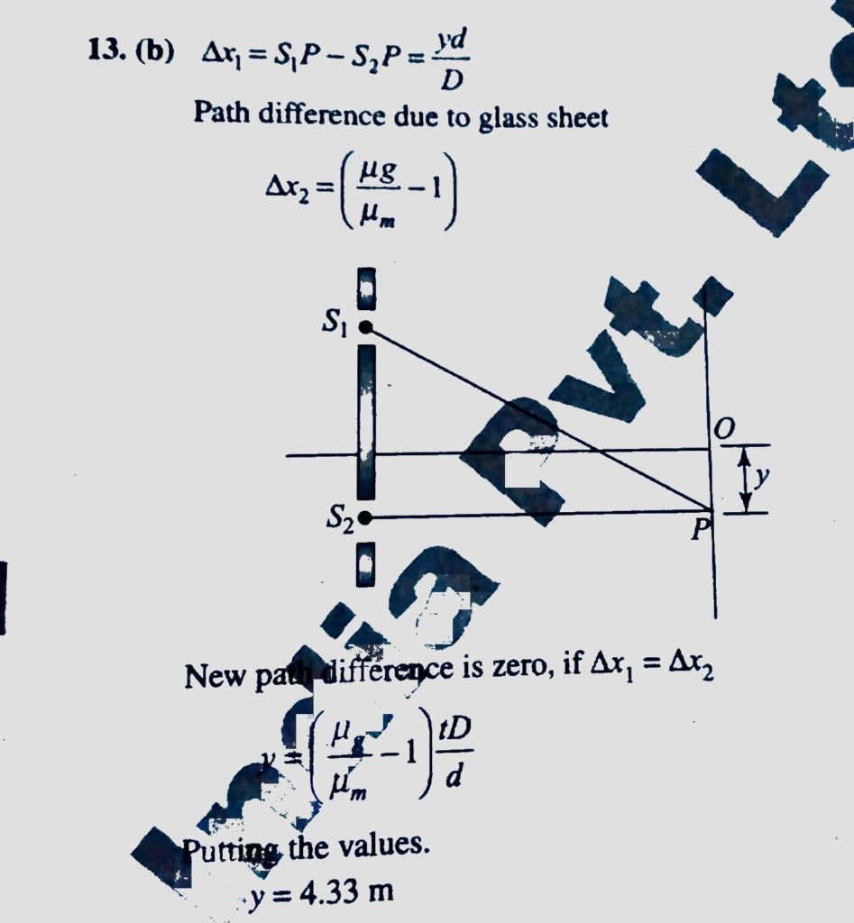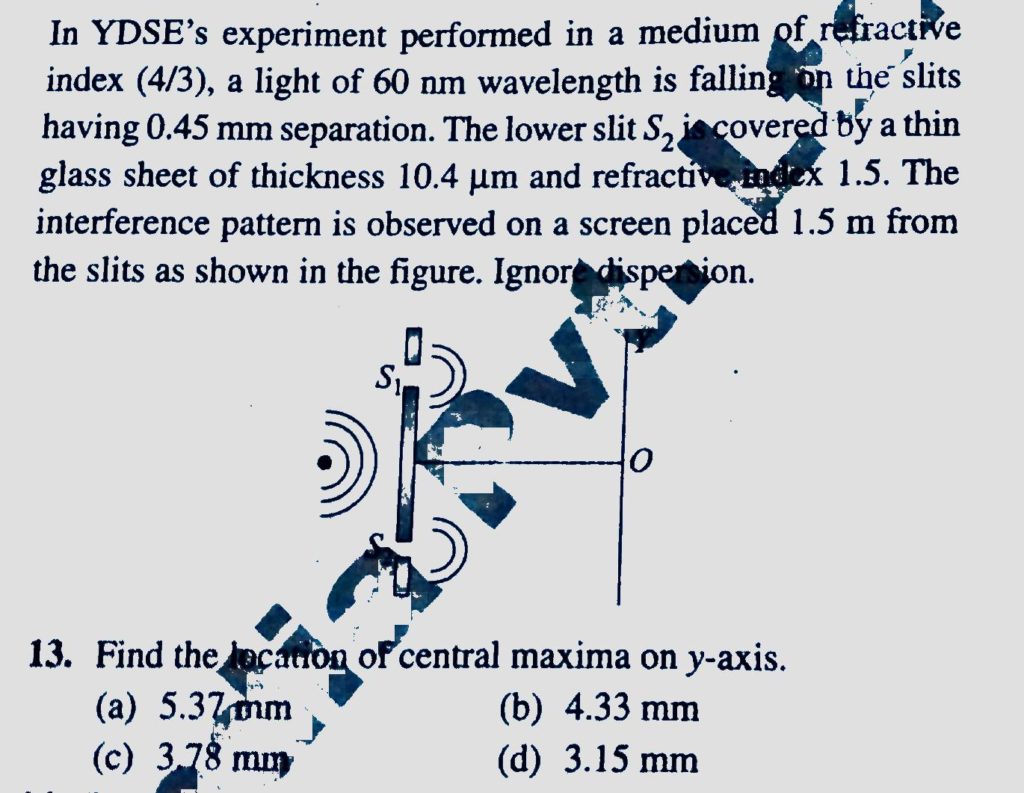 In YDSE’s experiment performed in a medium of refractive index (4/3), a light of 60 nm wavelength is falling ono the slits having 0.45 mm separation.t he lower slit S2 is covered by a thin glass sheet of thickness 10.4μm and refractive index 1.5 the interference pattern is observed on a screen palced 1.5m from the slits as shown in the figure. ignore dispersion. Find the location of central maxima on y-axis.
