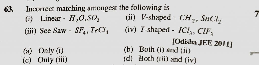 Incorrect matching amongest the following is (a) linear – H2O , SO2 (b) V -Shaped – CH2 , SnCL2 (c) see saw – SF4 , TeCL4 (d ) T – shaped – ICI 3, CLF3 CLF3 Incorrect matching amongest the following is (a) linear - H2O SnCL2 (c) see saw - SF4 SO2 (b) V -Shaped - CH2 TeCL4 (d ) T - shaped - ICI 3 December 7, 2020 Category: Uncategorised (JEE Advanced Physics by BM Sharma + GMP Solutions) , Facebook Messenger WhatsApp Share this:TwitterFacebook Related