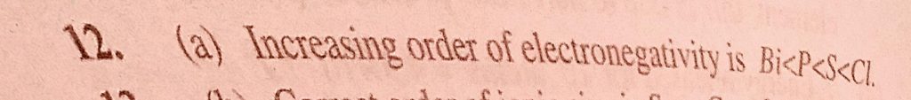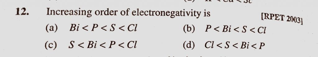 Increasing order of electronegativity is (a) Bi < P < S < Cl (b) P < Bi < S < Cl (c) S < Bi < P < Cl Increasing order of electronegativity is (a) Bi < P < S < Cl (b) P < Bi < S < Cl (c) S < Bi < P < Cl November 10, 2020 Category: Uncategorised (JEE Advanced Physics by BM Sharma + GMP Solutions) , Facebook Messenger WhatsApp Share this:TwitterFacebook Related