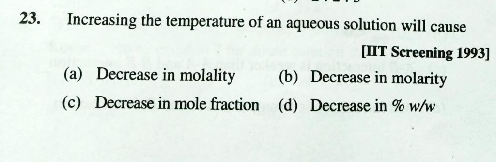 Increasing the temperature of an aqueous solution will cause (a) decrease in molality (b) decrease in molarity (c) decrease in mole fraction (d) decrease in % w/w Increasing the temperature of an aqueous solution will cause (a) decrease in molality (b) decrease in molarity (c) decrease in mole fraction (d) decrease in % w/w December 14, 2020 Category: Uncategorised (JEE Advanced Physics by BM Sharma + GMP Solutions) , Facebook Messenger WhatsApp Share this:TwitterFacebook Related