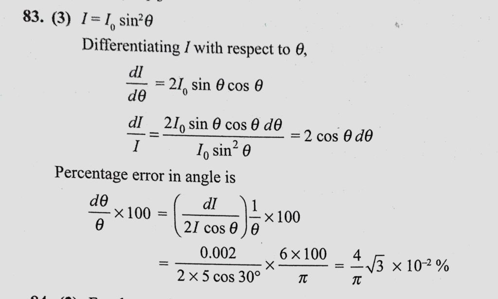 Intensity observed in an interference pattern is I = I0 sin^2 theta At theta = 30, intensity I = 5 +- 0.002. The percentage error in angle is intensity I = 5 +- 0.002. The percentage error in angle is Intensity observed in an interference pattern is I = I0 sin^2 theta At theta = 30 October 10, 2020 Category: Uncategorised (JEE Advanced Physics by BM Sharma + GMP Solutions) , Facebook Messenger WhatsApp Share this:TwitterFacebook Related