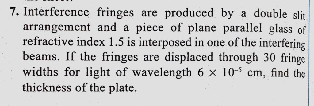 Interference fringes are produced by a double slit arrangement and a piece of plane parallel glass of refractive index 1.5 is interposed in one of the interfering beams. If the fringes Interference fringes are produced by a double slit arrangement and a piece of plane parallel glass of refractive index 1.5 is interposed in one of the interfering beams. If the fringes October 10, 2020 Category: Uncategorised (JEE Advanced Physics by BM Sharma + GMP Solutions) , Facebook Messenger WhatsApp Share this:TwitterFacebook Related