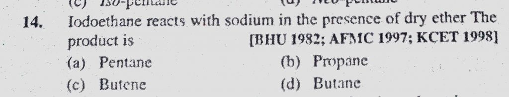 Iodoethane reacts with sodium in the presence of dry ether The product is (a) Pentane (b) Propane (c) Butene (d) Butane Iodoethane reacts with sodium in the presence of dry ether The product is (a) Pentane (b) Propane (c) Butene (d) Butane December 12, 2020 Category: Uncategorised (JEE Advanced Physics by BM Sharma + GMP Solutions) , Facebook Messenger WhatsApp Share this:TwitterFacebook Related